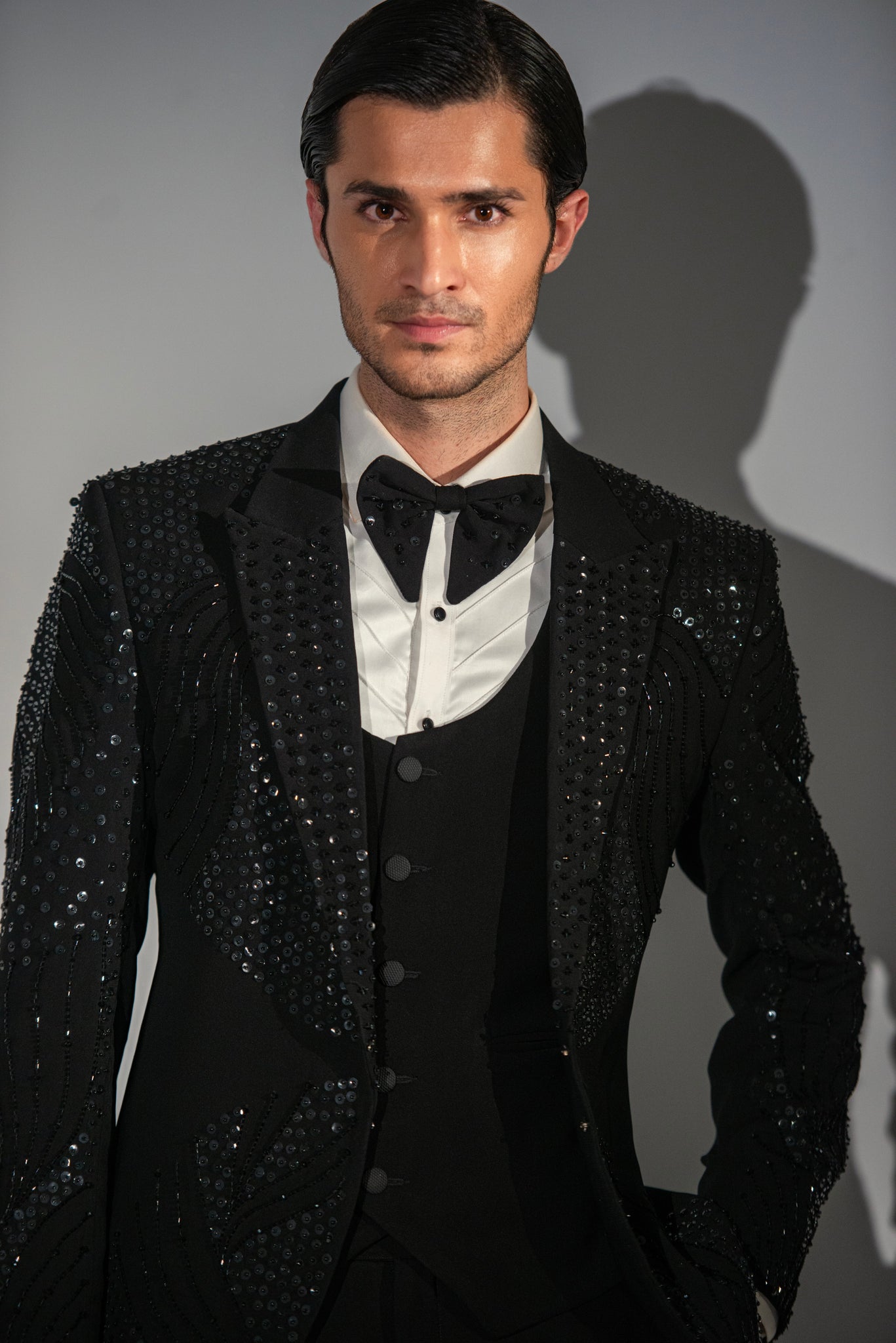 Black Georgette + Handwork Tuxedo Coat Pant & Waistcoat For Men's