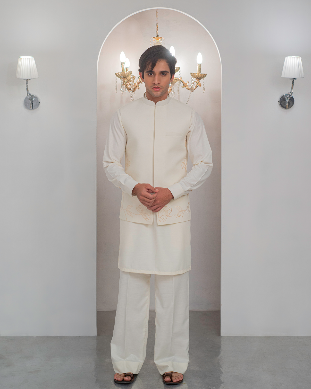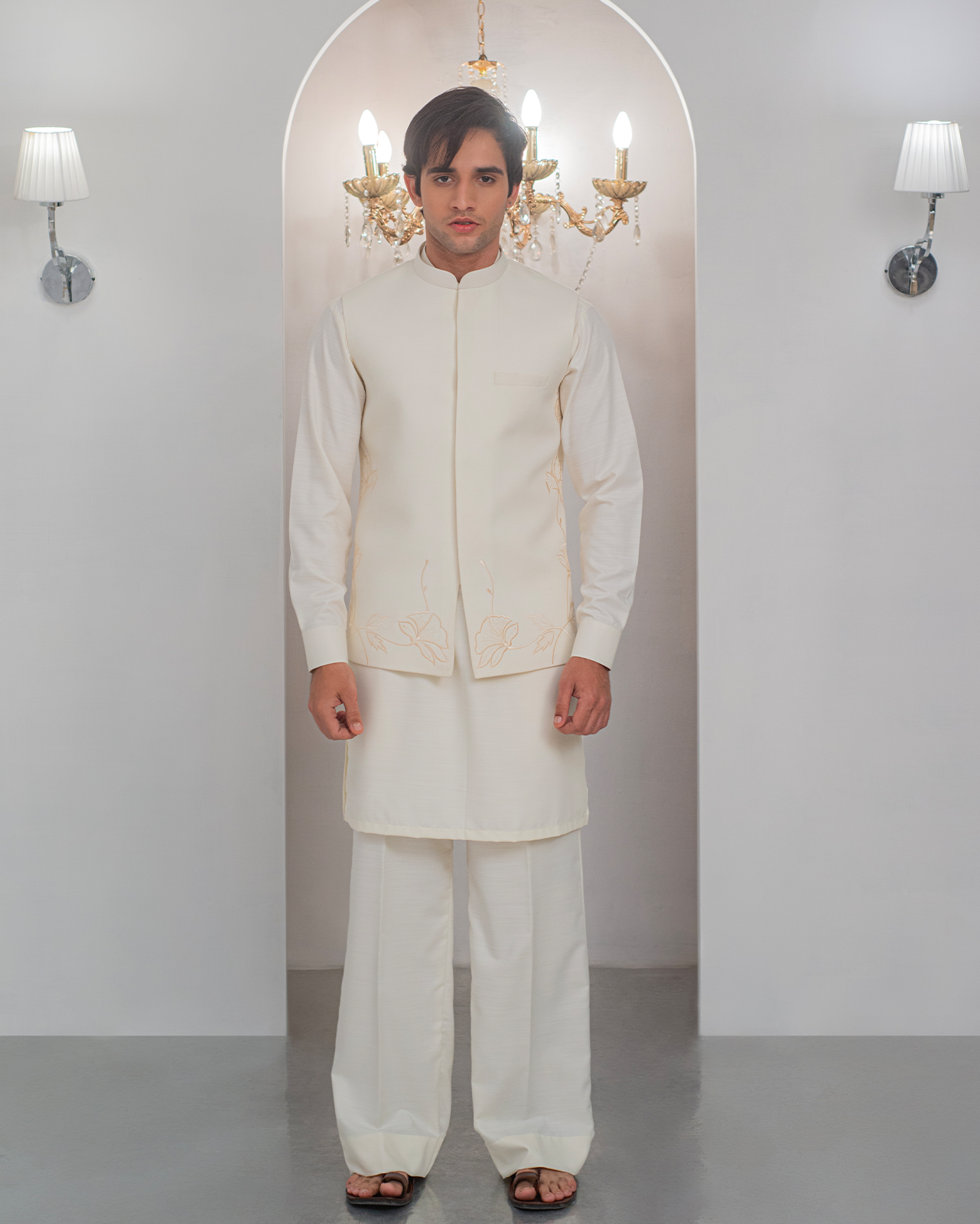 White Kurta Bell Bottom Pajama + Embroidered Waist Coat For Men's